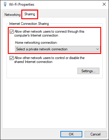 - Click on the “Sharing” tab and select “Allow other network users to connect using this computer’s internet connection.”