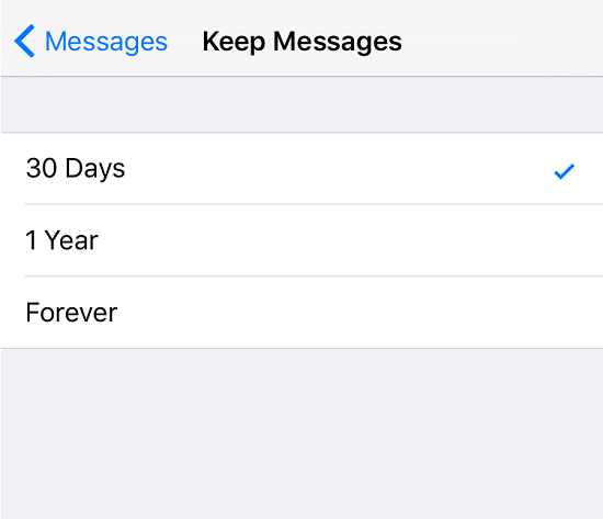 Messages can only be automatically deleted if they’re older than 30 days or one year, depending on your choice. If you want to dispose of audio and video messages automatically, you can set lower time frames.