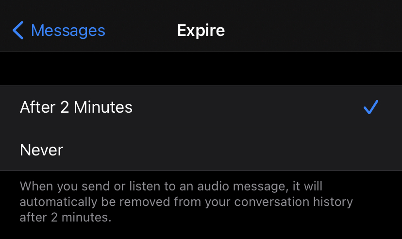 - Select After 2 minutes, or s elect Never if you want to start saving audio and video messages again.