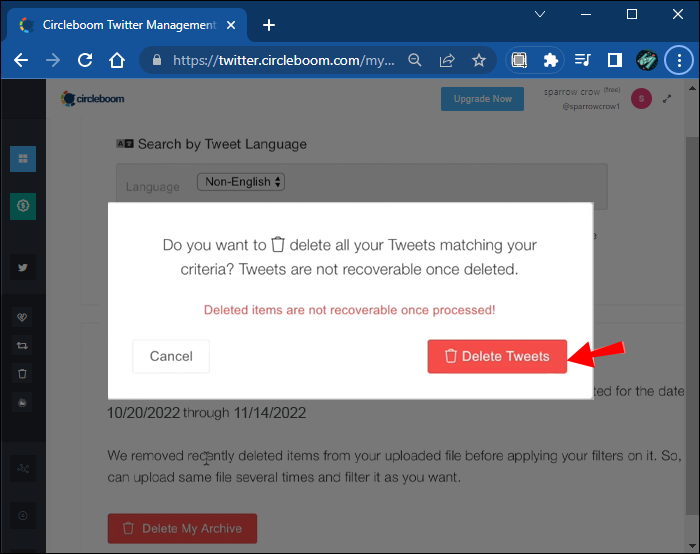 - Confirm your decision in the popup alert, and Circleboom will remove the desired tweets.