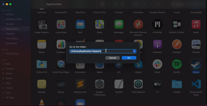 - Type in CMND + SHIFT + G, type in “~/Library/Application Support/” and hit Go.