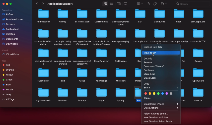 - Find the Steam folder and right-click it and select Move to Bin.