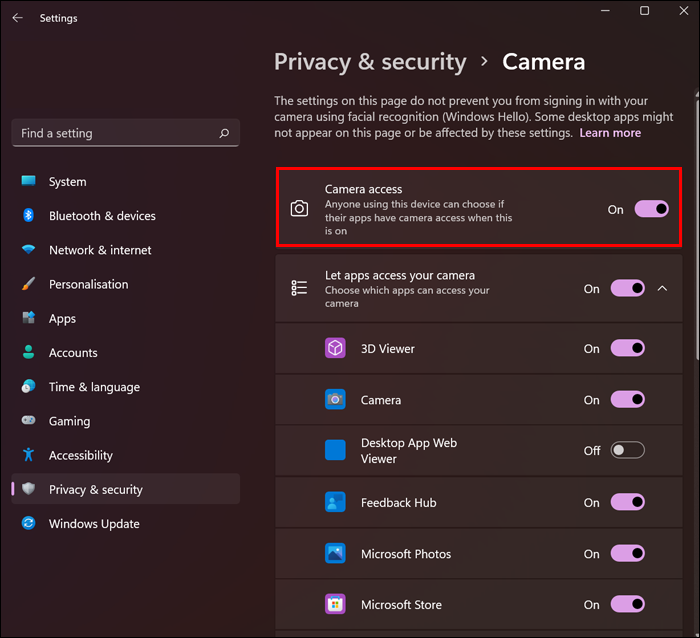 - Find the setting marked “Allow apps to access your camera,” and toggle the switch.