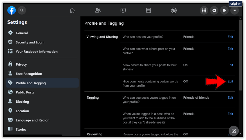 - Under the Reviewing section, move the slider next to Review posts you’re tagged in… or click on Edit in the same row to turn on reviewing.