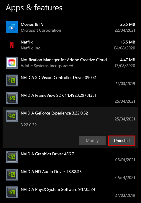 - Find “NVIDIA GeForce Experience” and then select uninstall.