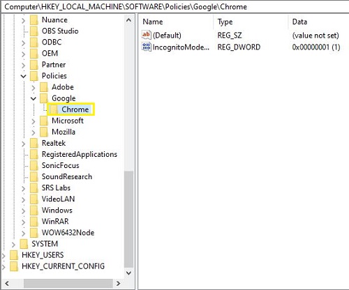 - Navigate to ‘HKEY_LOCAL_MACHINE/SOFTWARE/Policies/GoogleChrome’. Create a Google entry if there is not one by right-clicking in the left pane, selecting New and Key, and naming it Google. Repeat this from inside the Google key and call the new key Chrome’.