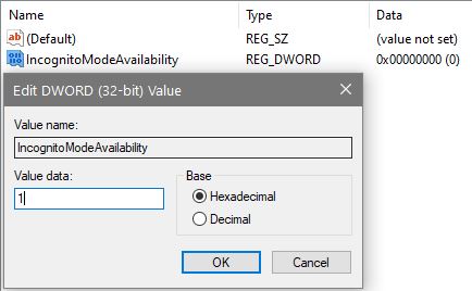 - Name it IncognitoModeAvailability and give it a value of 1.