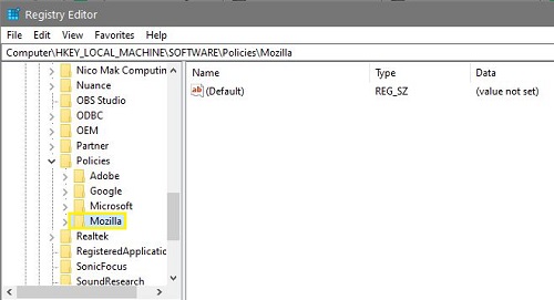 - Navigate to ‘HKEY_LOCAL_MACHINE/SOFTWARE/Policies/MozillaFirefox’. Create a Mozilla entry if there is not one by right-clicking in the left pane, selecting New and Key, and naming it Mozilla. Repeat this from within the Mozilla key and call the new key Firefox.