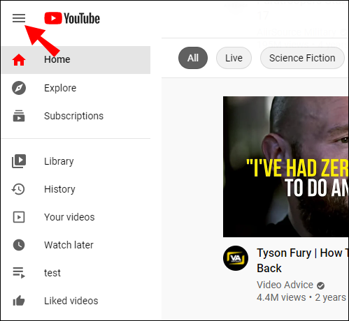1. Open your browser, go to youtube.com and click on the three horizontal lines in the top-left corner.