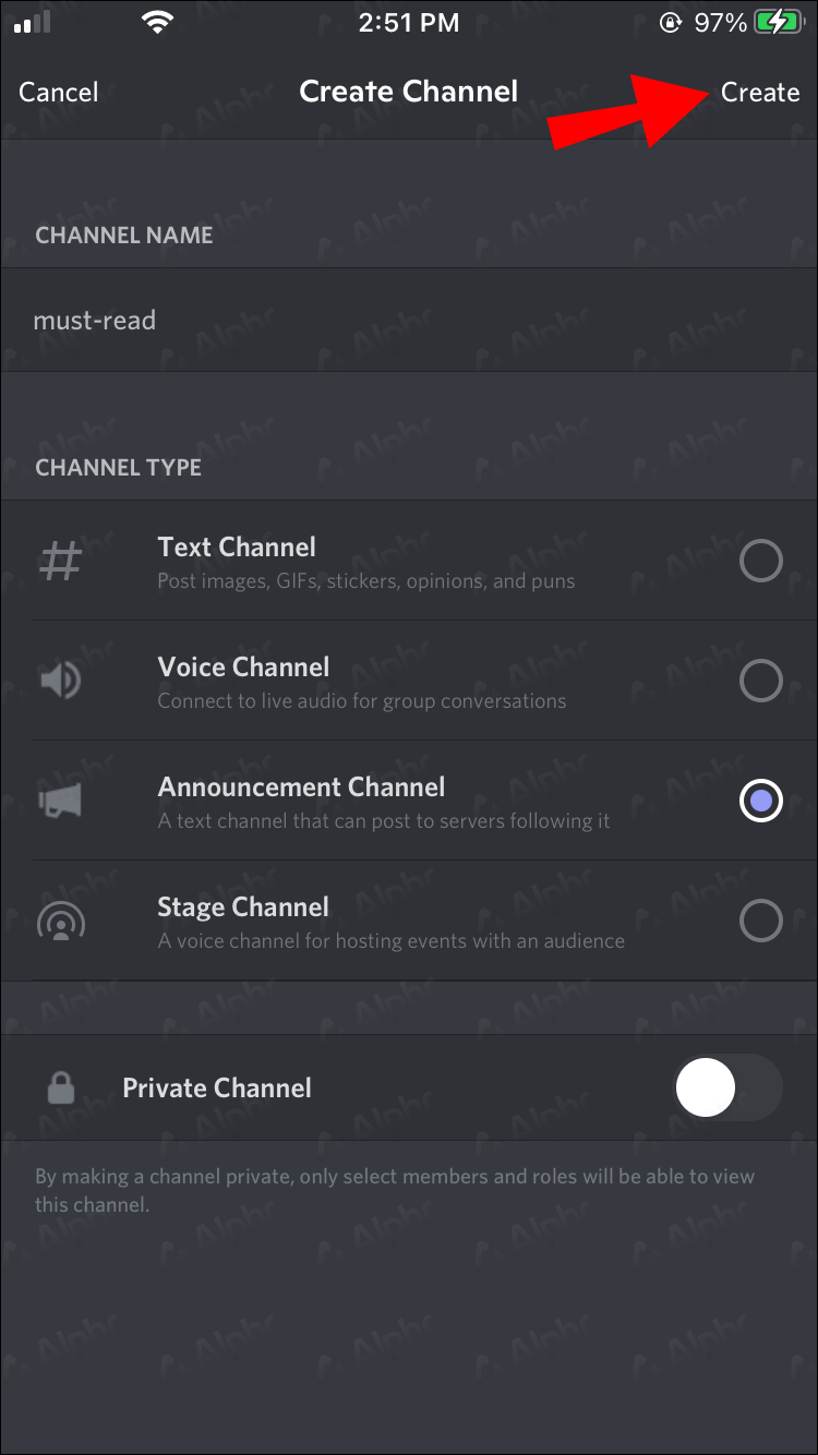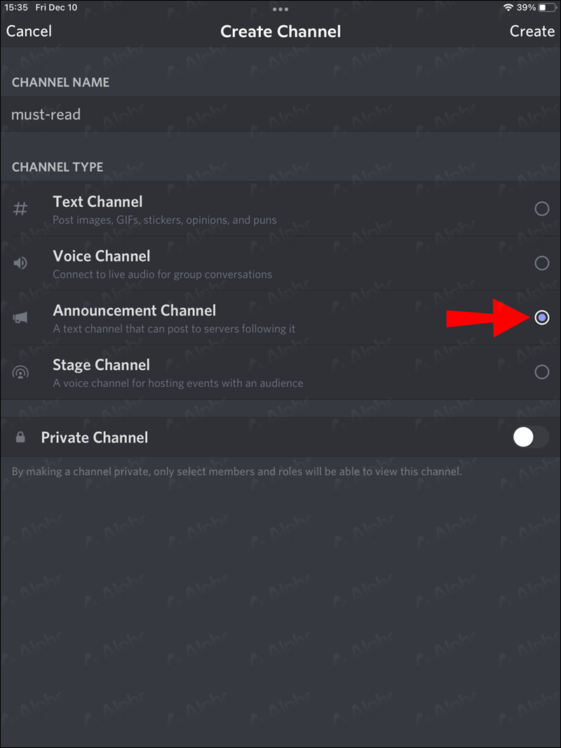 - Tap the “Announcement Channel” box to check it.