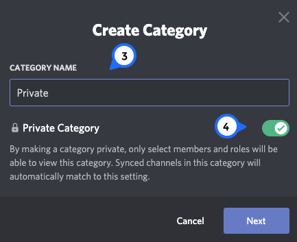 - Name your category and toggle the Private Category button on. Then, click Next.
