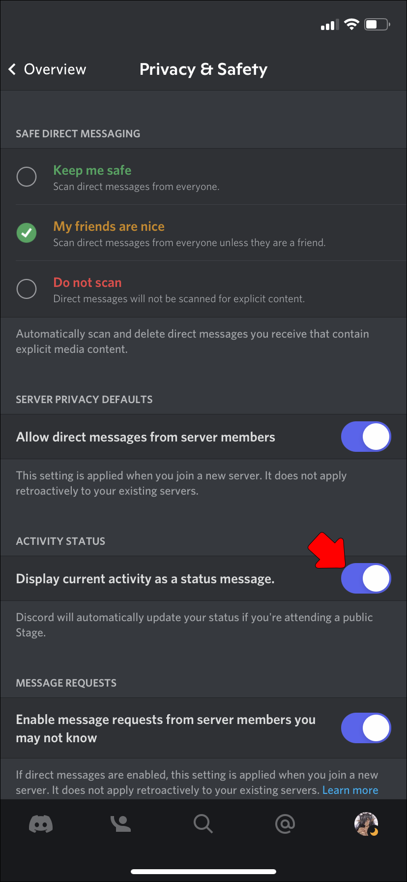 - Once you’re on the Privacy & Safety settings page, switch off the toggle for “Display current activity as a status message.”