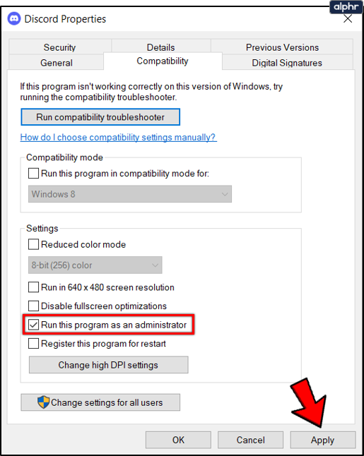 - Finally, enable Run This Program as an Administrator and click on Apply.