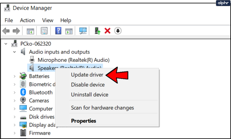 - Right-click the audio device and choose the Update Driver option.