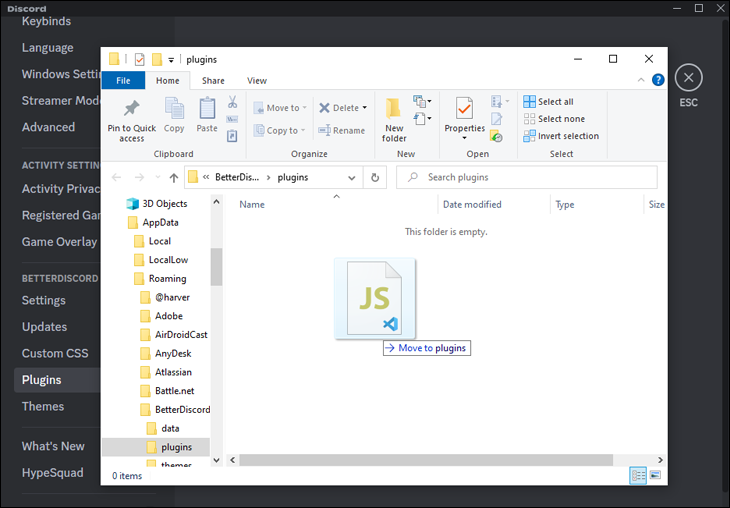 - Once the Plug-in Folder is open, add MessageLogger V2 by dragging it from its saved location and dropping it into the open folder.