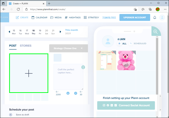 - Your work will show up in your Plann Media Collection, where you may write a caption and schedule an Instagram post.