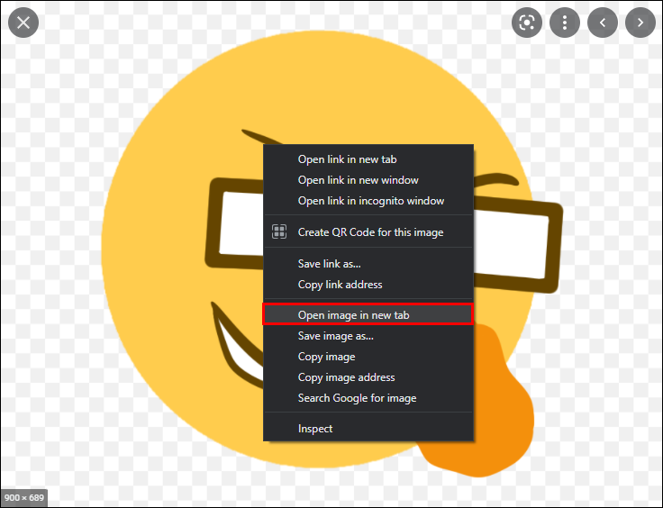 - Press “Open image in new tab” to access the emoji ID. The emoji will now open in a separate tab.
