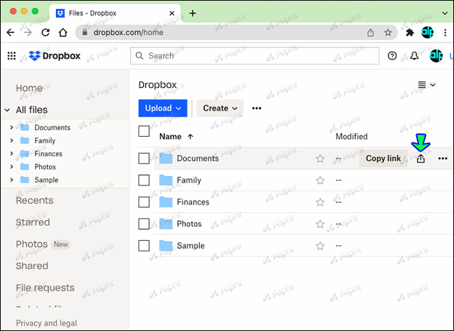 - Place your mouse pointer over the file or folder you wish to share and select the “Share” icon. It looks like a rectangle with an up arrow.