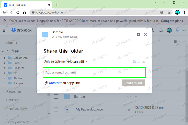 - Enter the email address, the name of the person with whom you’d want to share the file or folder, then pick someone from the results. You may add an unlimited number of persons.
