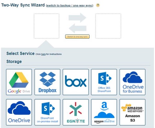 - Next, you will be presented with a grid full of cloud storage logos – click on the service from which you would like to be your sync. Note: for the purpose of this tutorial, Dropbox will be used as the primary share folder.