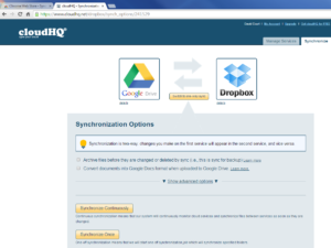 - Repeat the process with your desired secondary cloud service and folder that you would like to sync via cloudHQ. Once selected, you will see a page that gives you the option to Synchronize Continuously or Synchronize Once; select as appropriate and cloudHQ will start work right away.