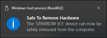 - You will receive a message that says, “Safe to Remove Hardware.” Once you’ve unplugged the device from your Windows 10 computer, you’re done.
