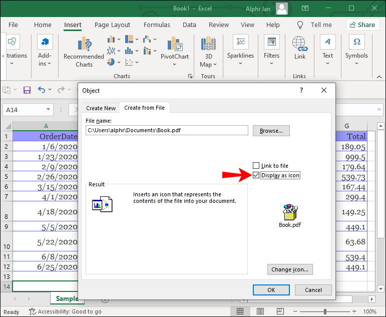 - In the “Object” window, select the “Display as icon” checkbox to display the file as an icon. If not, a preview of the PDF will display.