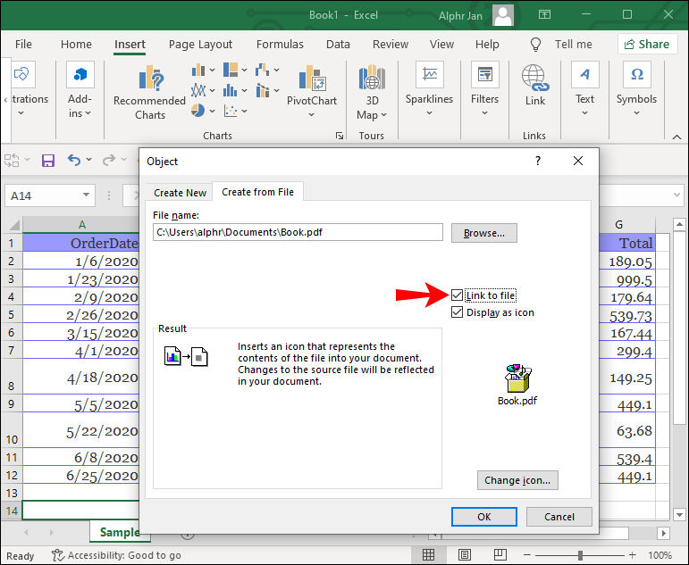- If you want changes made to the original PDF file to update in the embedded version, choose the “Link to file” option.