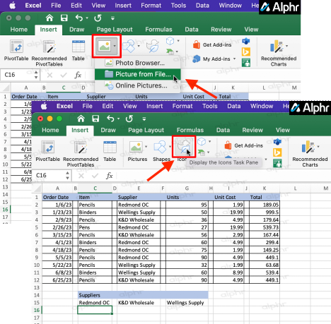 - Click on the “Insert” tab at the top and choose “Photo -> Picture from File..” or “Icons” depending on your preference.