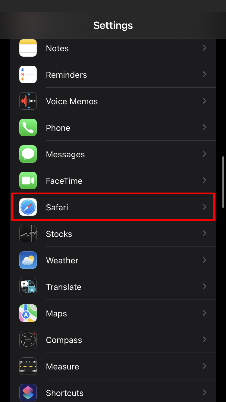 - Go to the Settings app, scroll to the bottom of the screen, and select “Safari.”