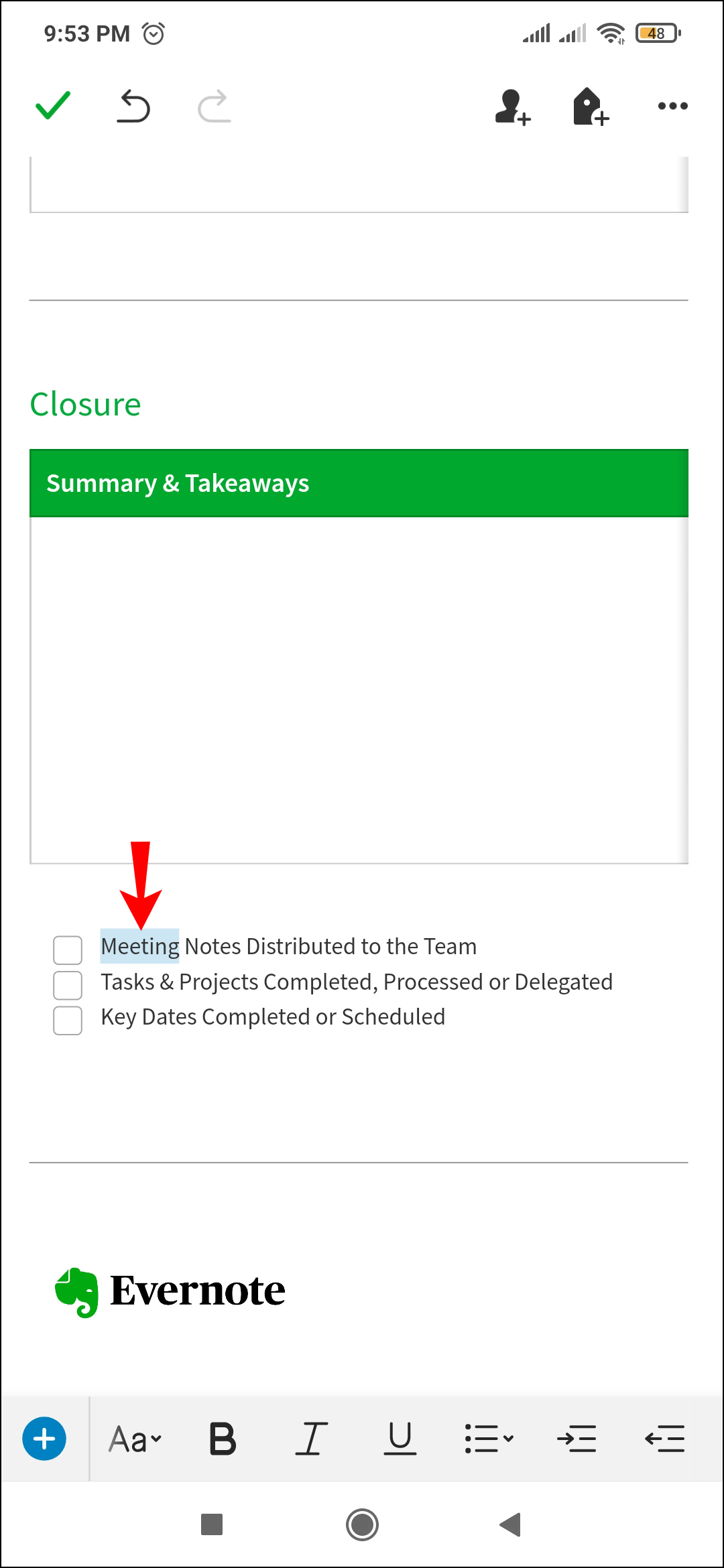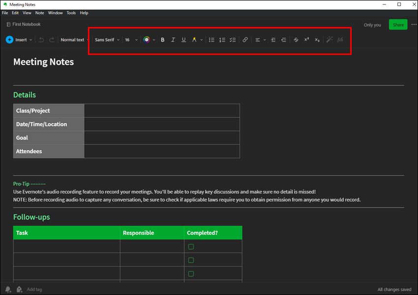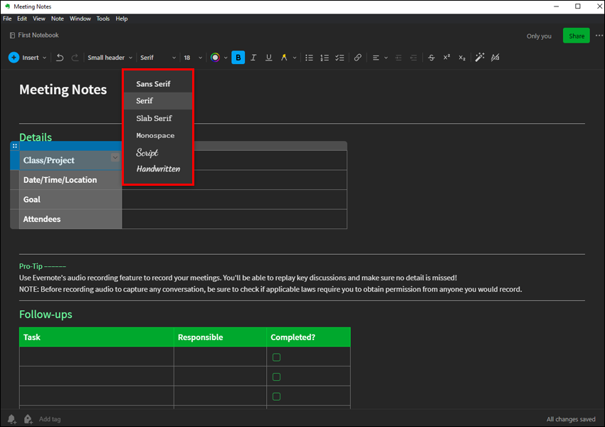 Even though changing the default font on Android devices is done similarly to the iOS app, there is a little more you could do to be creative with styling your notes and documents. The first way to change the font in Evernote is the following default method: