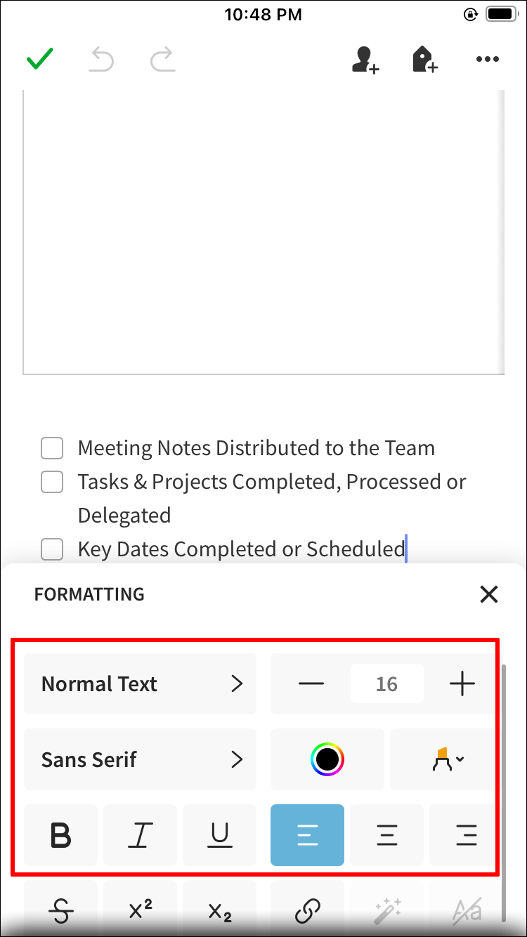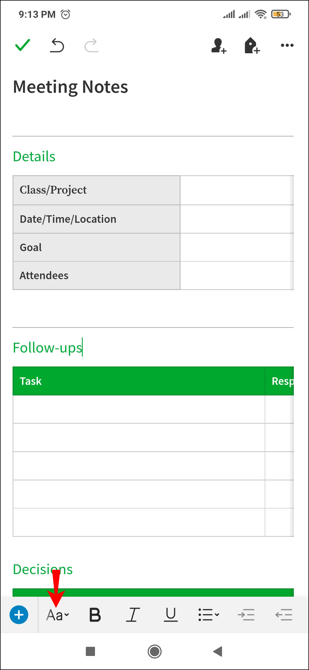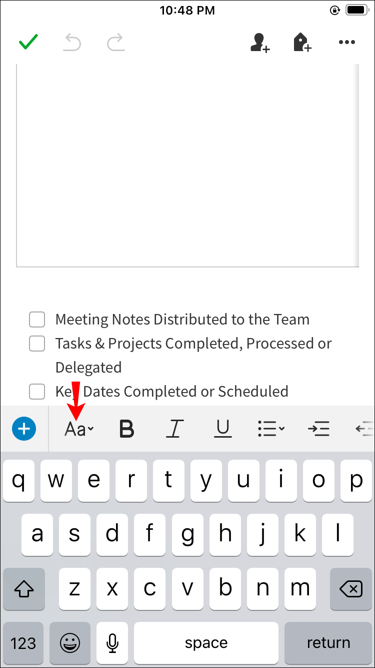 - Tap on the letter “A” with the three horizontal lines next to it. This button is located right above the keyboard, on the Editing tab.