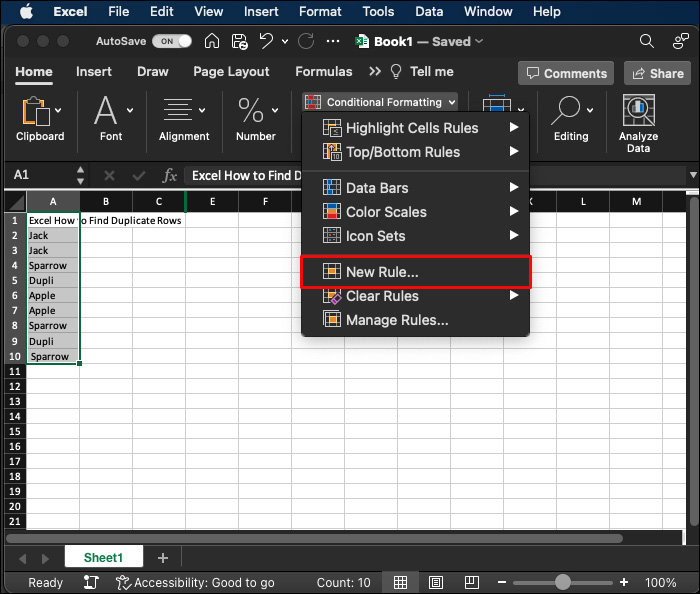 You’ll need to use the COUNTIFS formula in Excel’s formatting option to identify and highlight your duplicate rows. Here’s how to do so: