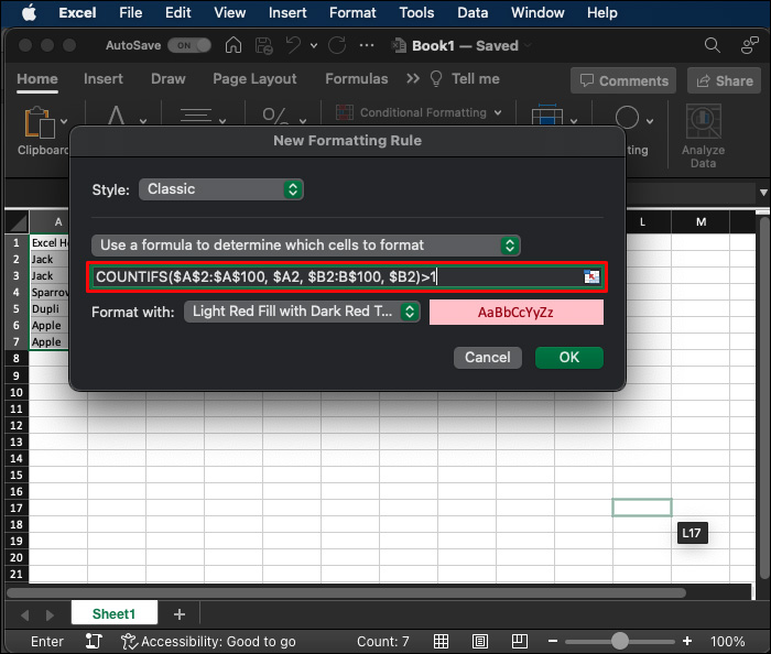 COUNTIFS($A$2:$A$100, $A2, $B2:B$100, $B2)>1in the box and choose a formatting style.