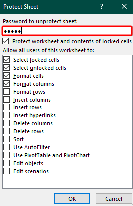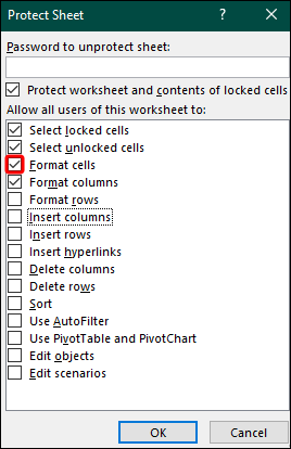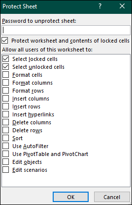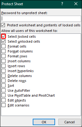 e. “Insert and Delete” keeps the user from adding and removing cells. - Check the box next to the “Sheet” option.