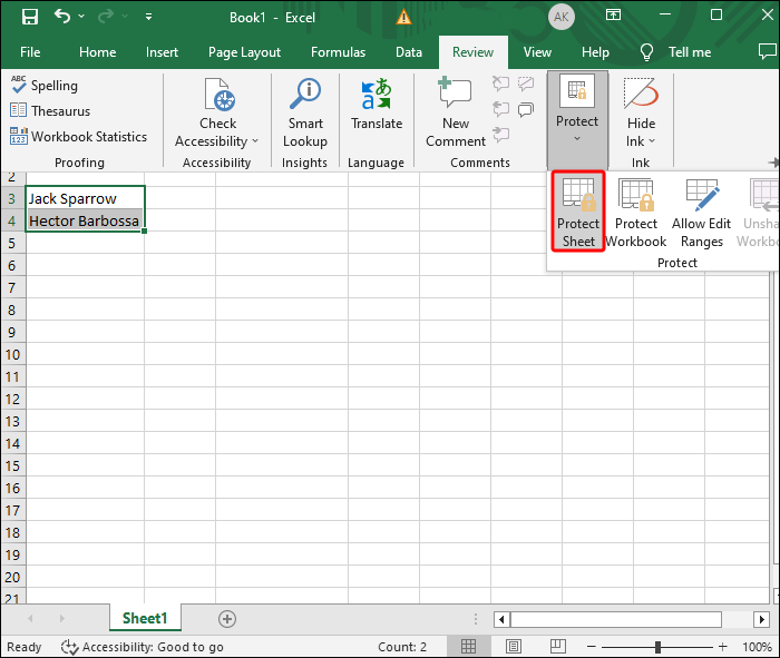 - Choose “Review,” followed by “Changes,” and “Protect Sheet.”