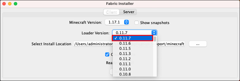 - Select the Minecraft version and Loader version you want to install from the relevant dropdown menus. (We suggest sticking with the latest loader version.)