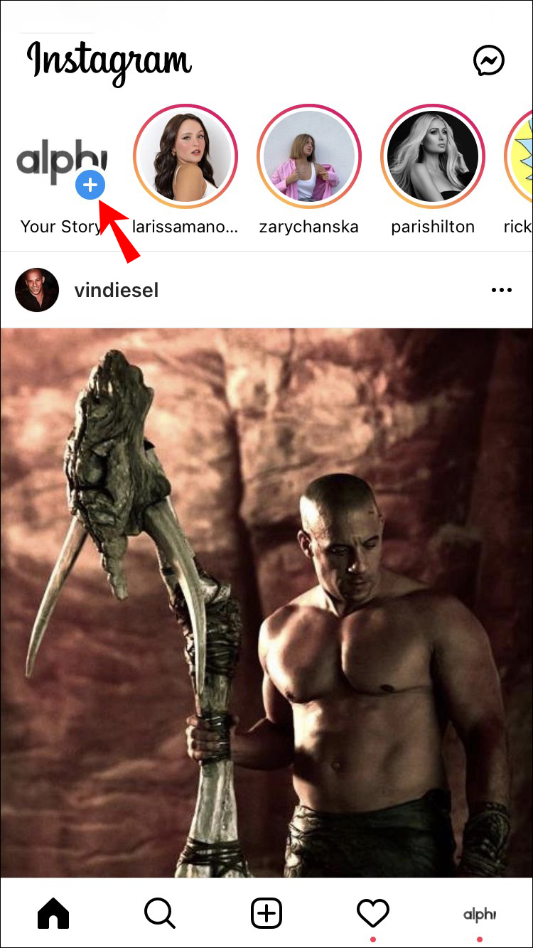 - Tap your profile picture with the blue plus sign at the top-left corner to add a story.