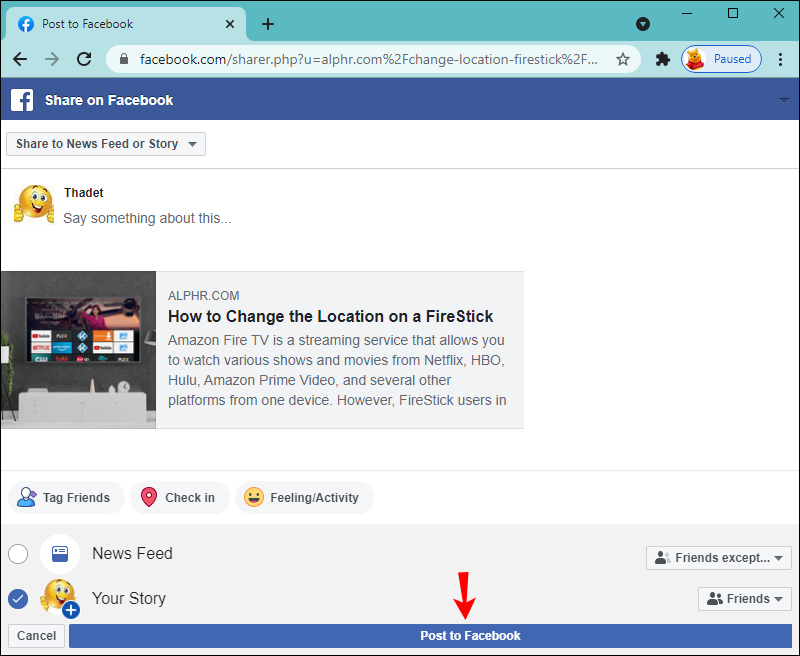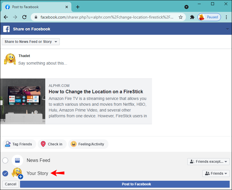 - Select Your Story and unselect News Feed. Or, if you want to post the link to your story and News Feed, select both.