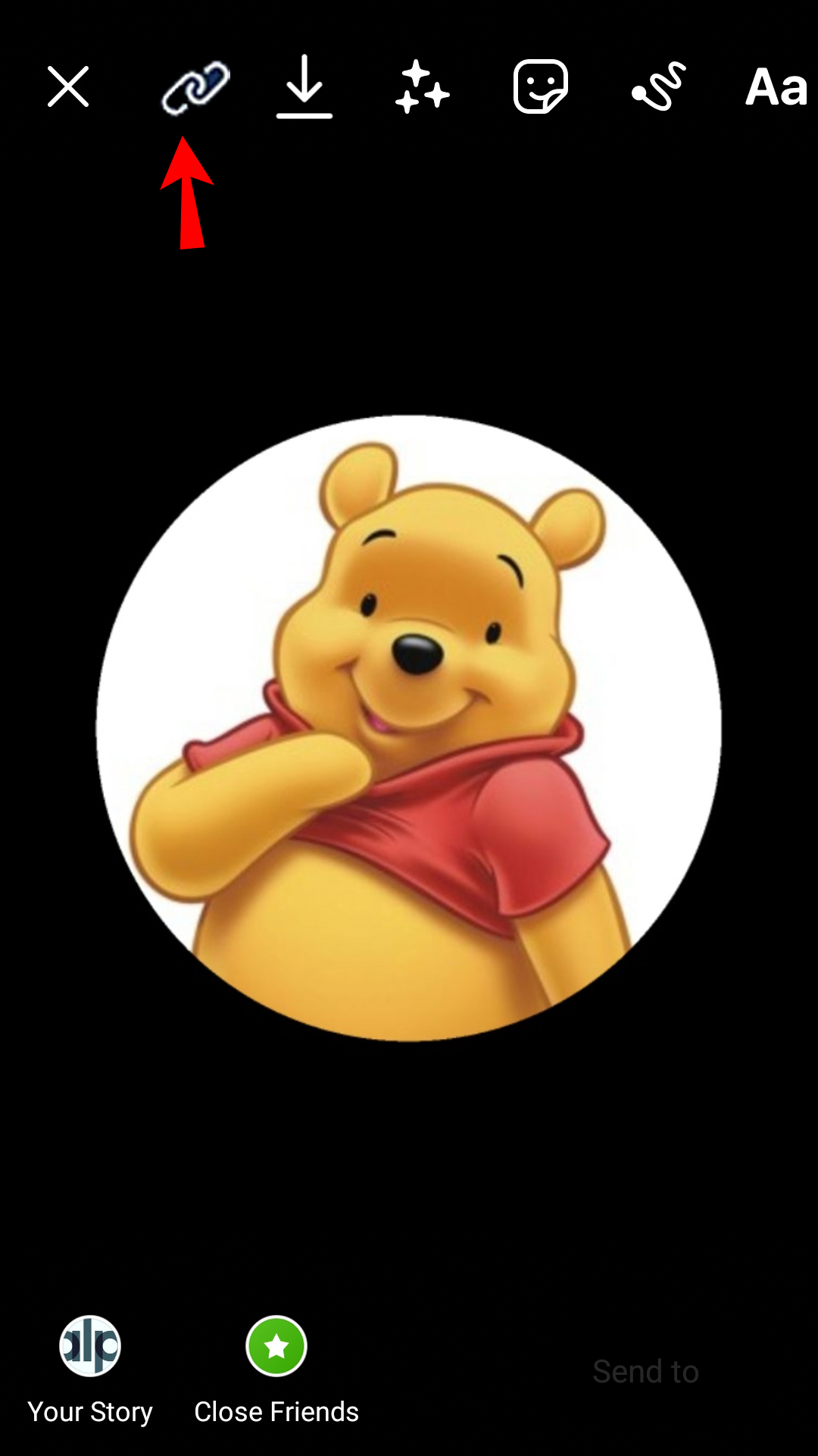 - Take or upload a photo to your story, tap the chain link icon at the top, and paste the link from the first step under Web link.