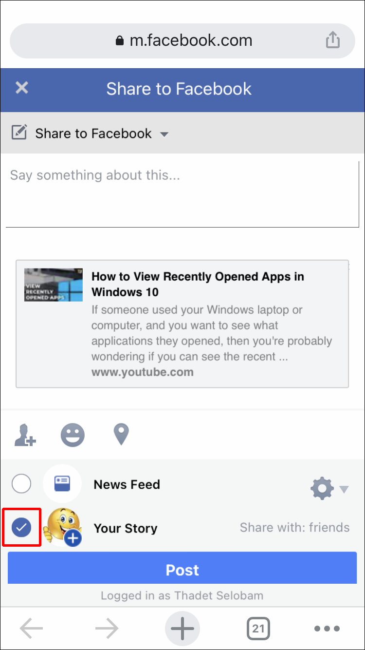 Since YouTube is connected to Facebook, you can use it to add a video link to your story. For this method, it’s crucial not to use the YouTube app but to open it from your browser and use desktop view. Otherwise, the option to share to Facebook won’t be available.