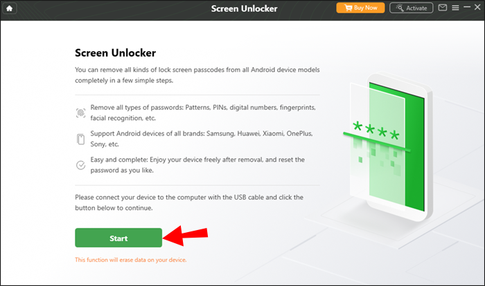 - Connect the Android device you wish to unlock and press the “Start” button.