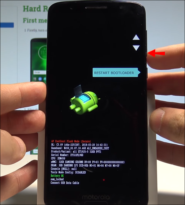 - Hold the Power button along with the Volume down button. Do so until you see your phone booting into its “Fastboot” Mode. System information will appear together with a menu on the right-hand side of the screen.
