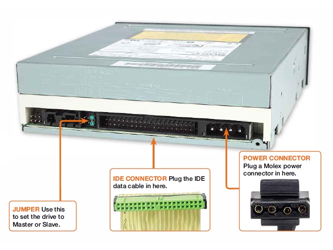 Older DVD drives with an EIDE connection use a Molex power connector. This plug is a large (compared to other PC plugs) white or black four-pin connector coming from your power supply. Locate a free one and push it into the drive’s power socket. Use a bit of force to ensure proper connection. Give the plug a GENTLE tug to make sure it’s secure.