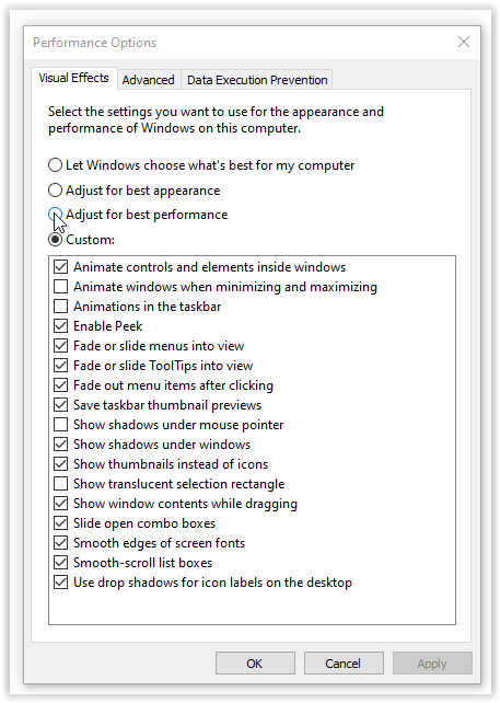 - In the Performance Options window that opens, choose to disable specific visual effects from the list, or you can simply select Adjust for best performance to turn them all off.