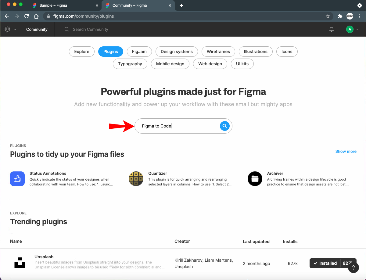 - Type “Figma to Code” in the search bar and choose “Plugins” at the top to get relevant results.