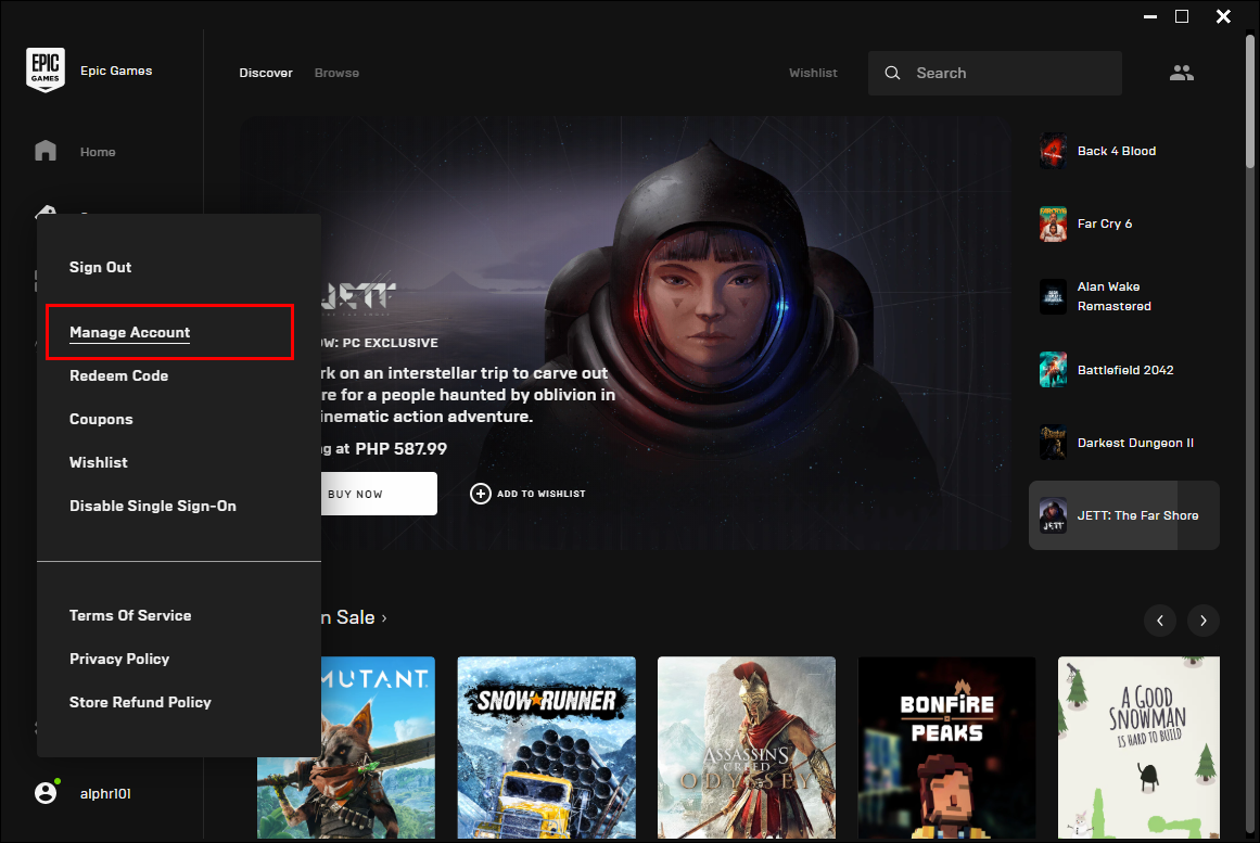 3. Select “Manage Account.” Epic Games portal will open in a new browser window.