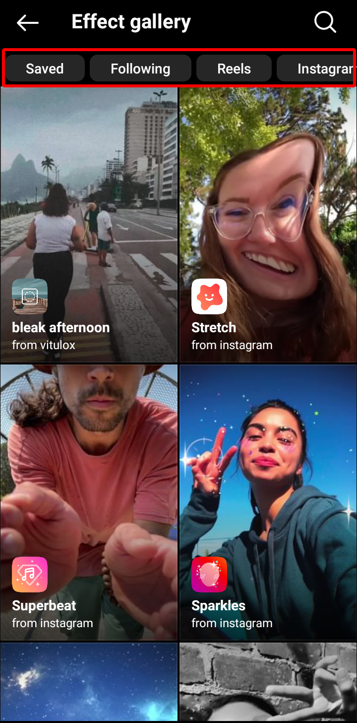 - Move through existing tabs to choose a category of Instagram filters you want to explore.