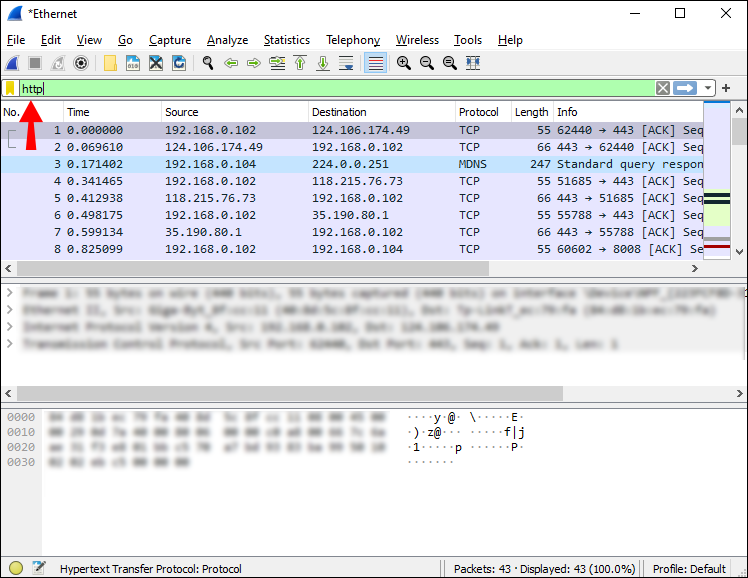 - To see the HTTP packets only, enter “HTTP” in the “Filter” text field towards the top-left.