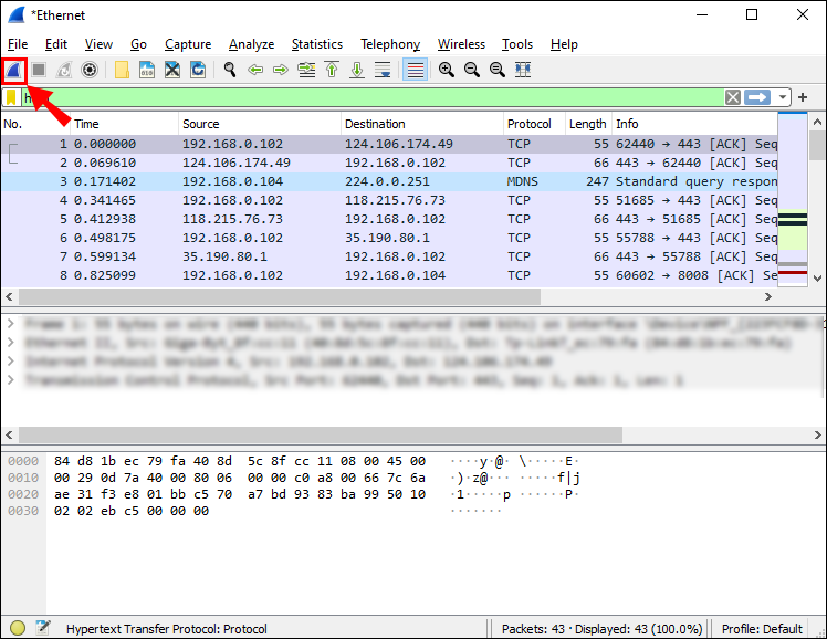 - Refresh the page. Once Wireshark displays the HTTP packets for your website request, stop the capture by clicking on the stop icon.
